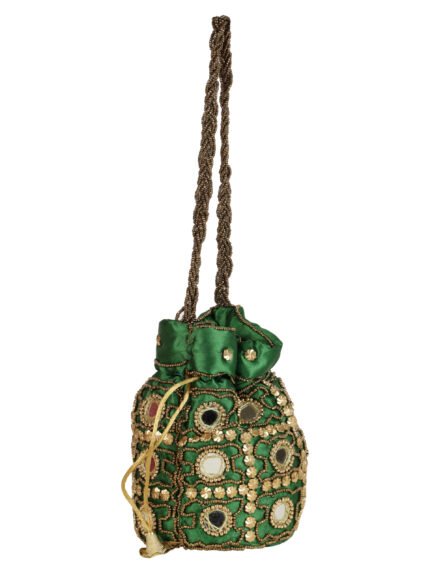Green and gold-toned embellished potli clutches Has wrist loop 1 main compartment with drawstring closure Size & Fit 18 x