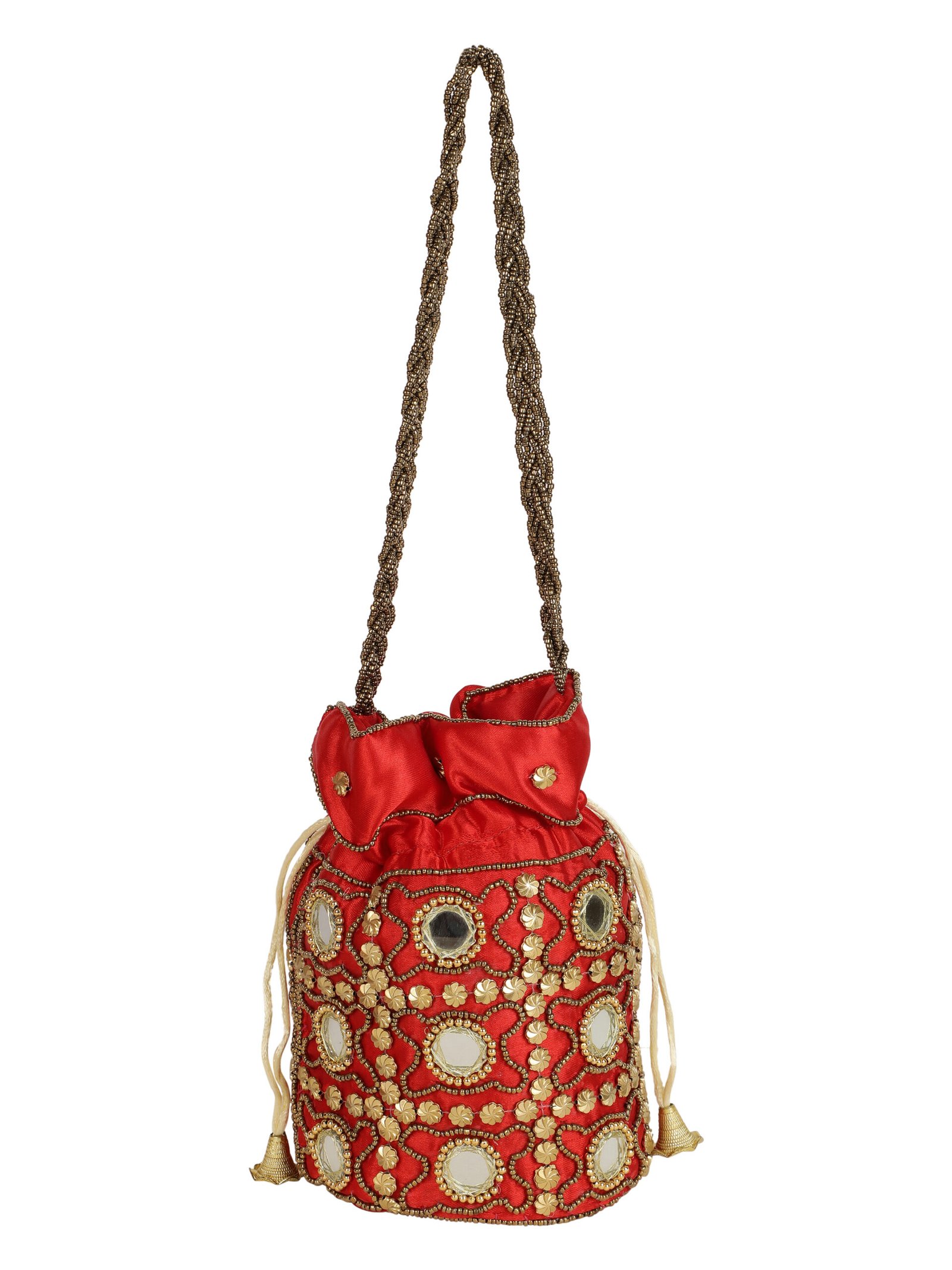 Red and gold-toned embellished potli clutches Has wrist loop 1 main compartment with drawstring closure Size & Fit Height: 18
