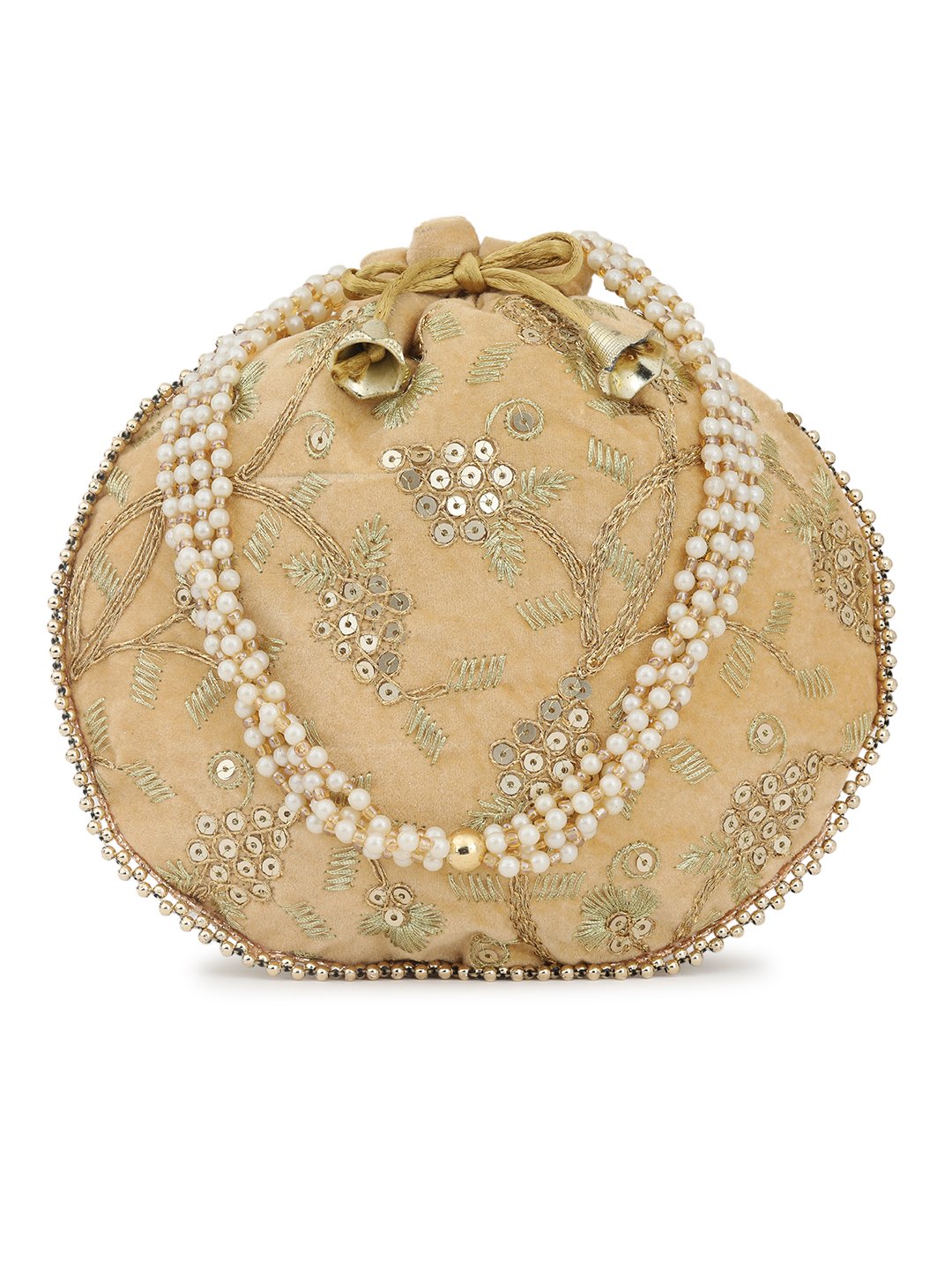 Beige and white embellished potli clutches Has wrist loop 1 main compartment with drawstring closure Size & Fit Height: 22 cm Width: 22 cm Depth: 7.62 cm Material & Care Fabric Wipe with clean, dry cloth
